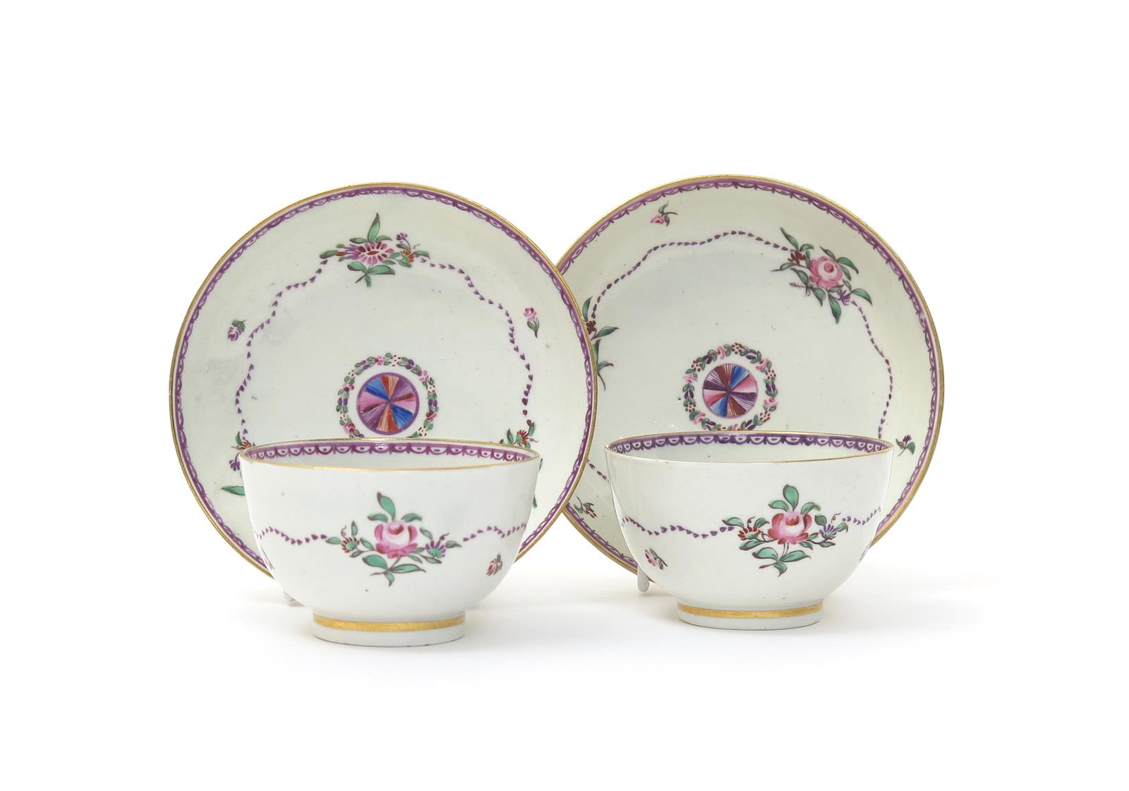 A pair of Caughley teabowls and saucers c.1790, painted in the Chinese export manner with the Target pattern, a small polychrome roundel within famille rose floral borders, 12.5cm. (4)