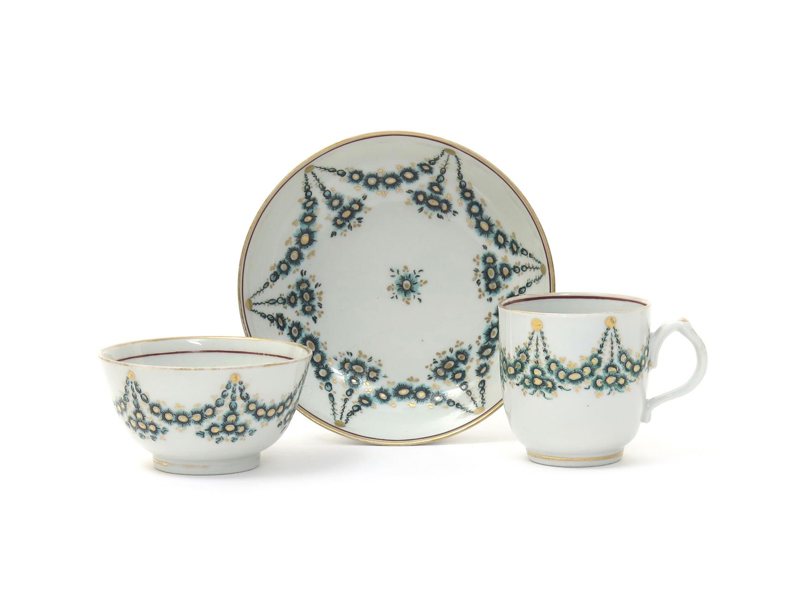 A rare New Hall trio c.1785-90, comprising a teabowl, coffee cup and saucer painted with swags of flowers in green, black and gilt, suspended from gilt dots, a crack to the saucer, 12.9cm. (3)