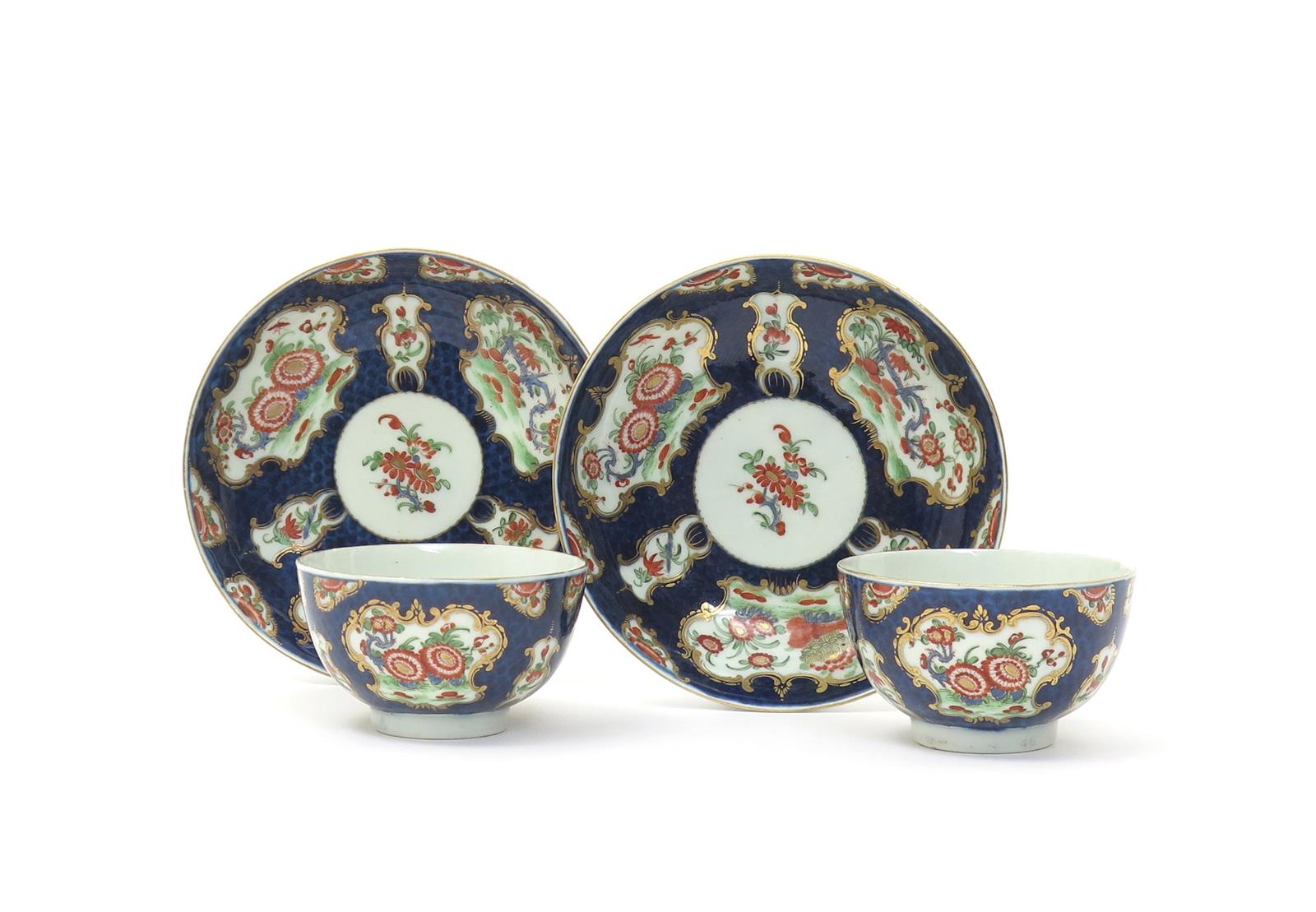 A pair of Worcester teabowls and saucers c.1760-65, painted with panels of flowers and banded hedges in the Kakiemon palette, reserved on a blue scale ground, open crescent marks, 12cm. (4)