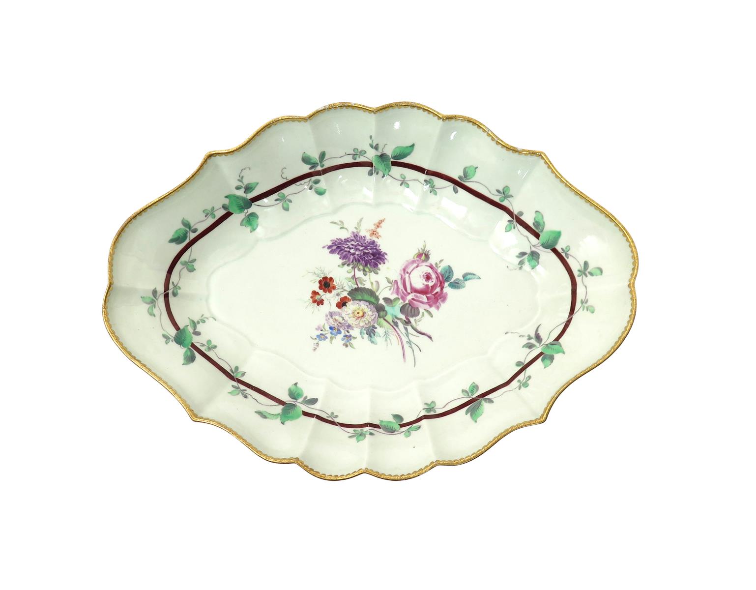 A Worcester Giles-decorated dessert dish c.1770, painted in the London atelier of James Giles with a loose spray of flowers including rose, forget-me-not and chrysanthemum, the moulded cavetto with a brown line border garlanded with leaves, with a gilt dentil rim, 29.5cm.