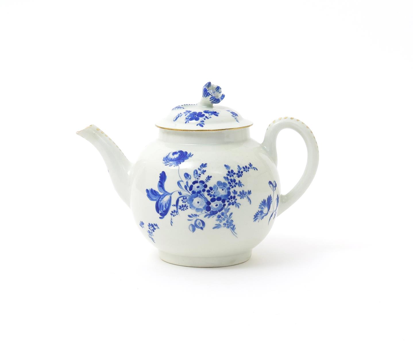 A Worcester Giles-decorated teapot and cover c.1770, the globular body painted in the London atelier of James Giles with loose sprays of flowers in dry blue, the spout and handle with a gilt dash design, the cover's finial formed as a single flower stem, a few small chips, 19cm across. (2)