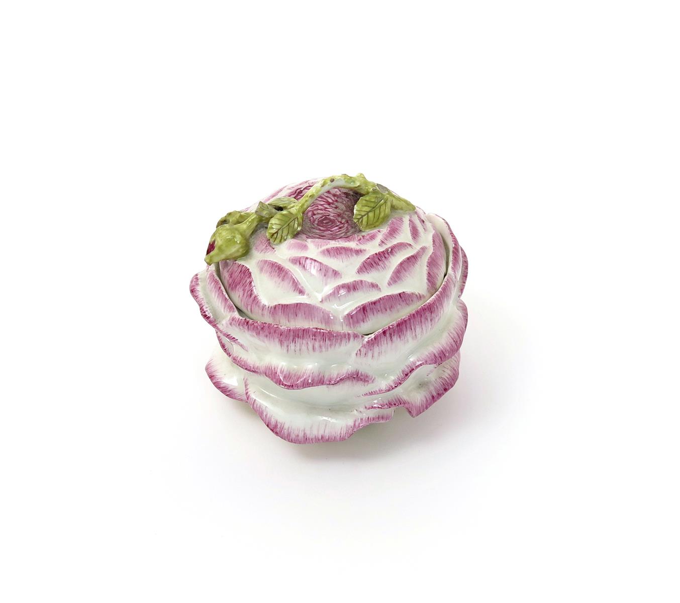 A Chelsea rose box and cover c.1753-55, modelled as a large rose bloom with petals edged in pink, the cover's finial formed as a short stem with a single bud, a few small chips, 7.5cm high. (2)