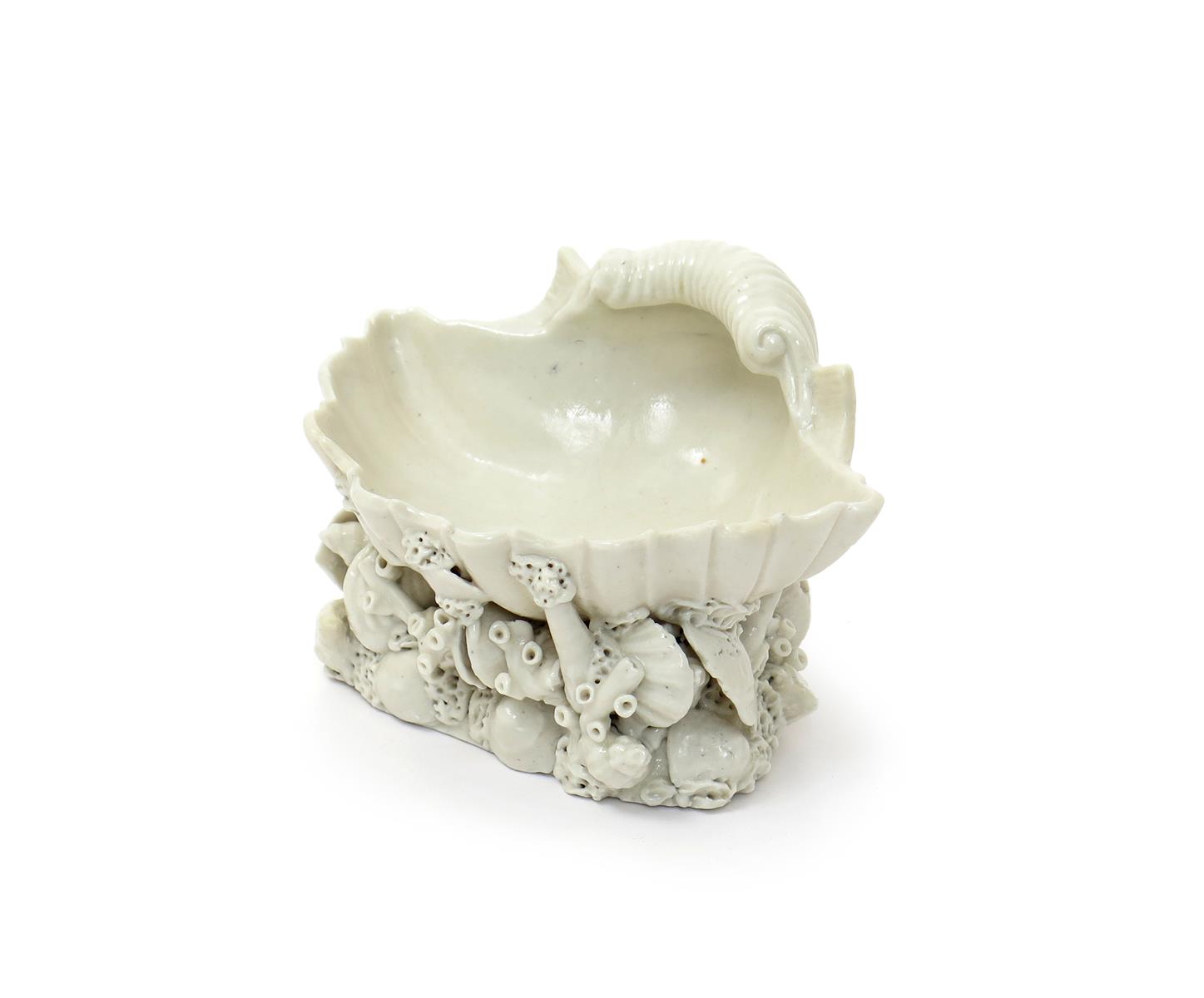 A Plymouth shell salt c.1768-70, left in the white, the large shell supported on a base of further smaller shells and coral, a small amount of good restoration, 12.7cm across.