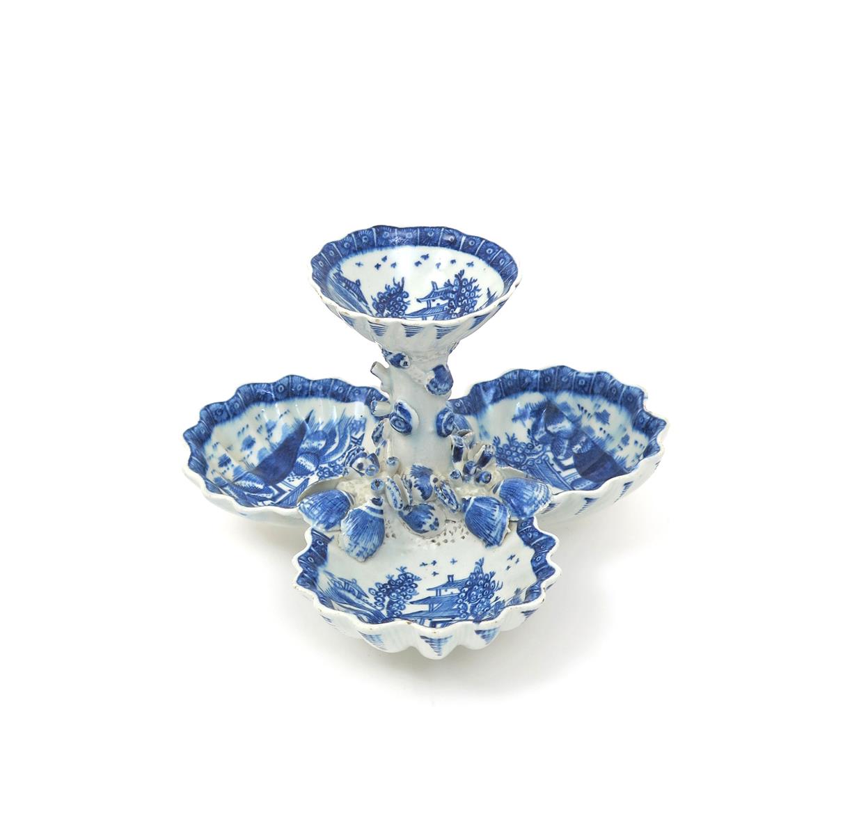 A Bow blue and white sweetmeat stand or pickle dish c.1765-70, formed as three joined scallop shells, a circular dish rising from a central pillar, all painted with a pagoda landscape scene within a cell diaper border, the stem applied with small shells and coral, raised on three peg feet, 13cm high.