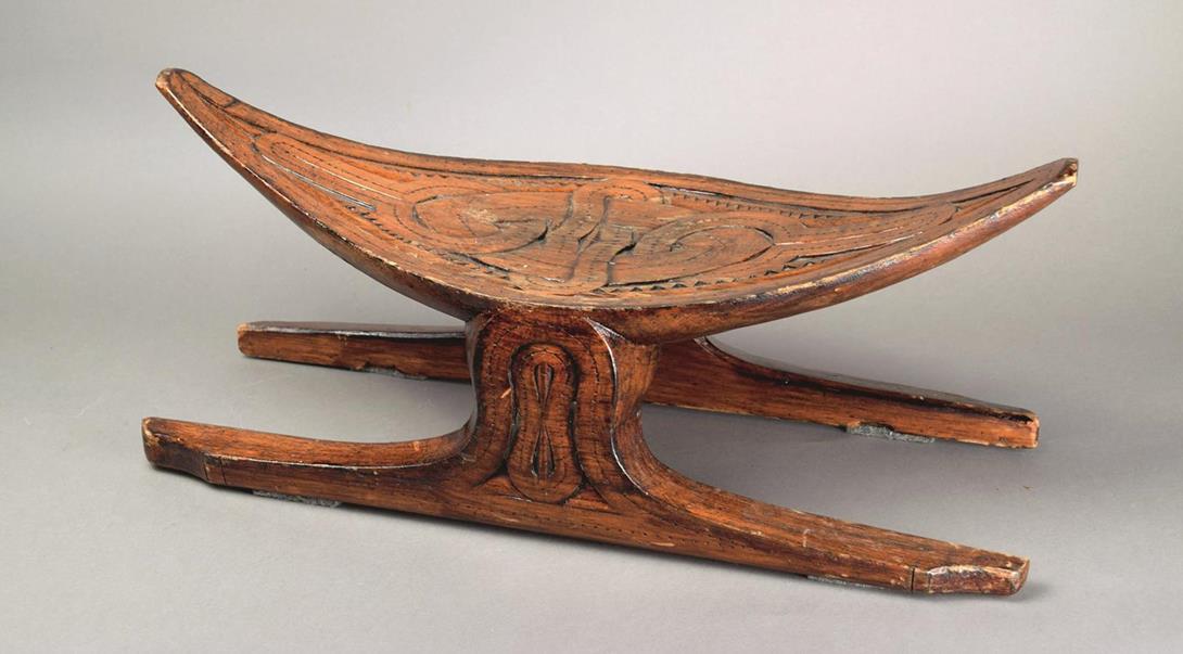 wood, with a crescent shape seat with carved entwined symbols and on sleigh supports,