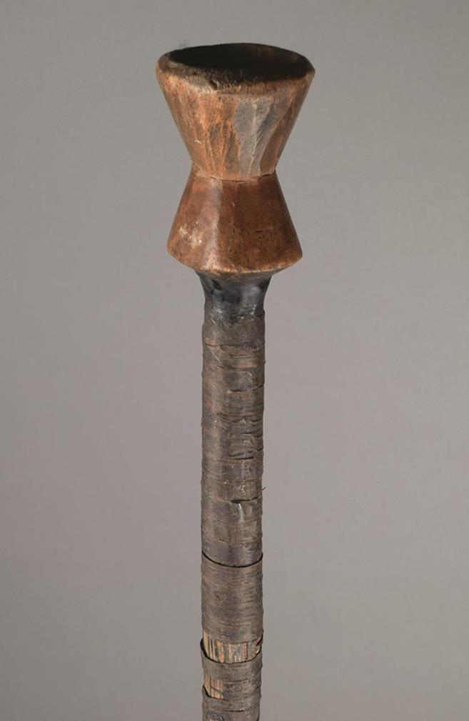 An Amazon blow pipe palmwood with coiled leaf fibre and a wood hour glass shape mouthpiece