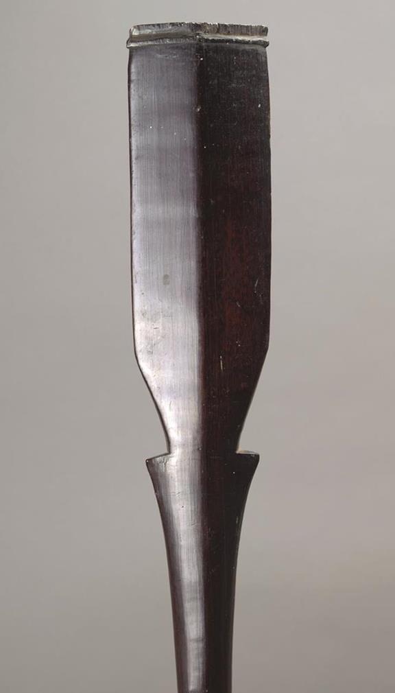 wood with a faceted blade with a flanged rim and flat top, with a flared and tapering handle with pointed terminal,