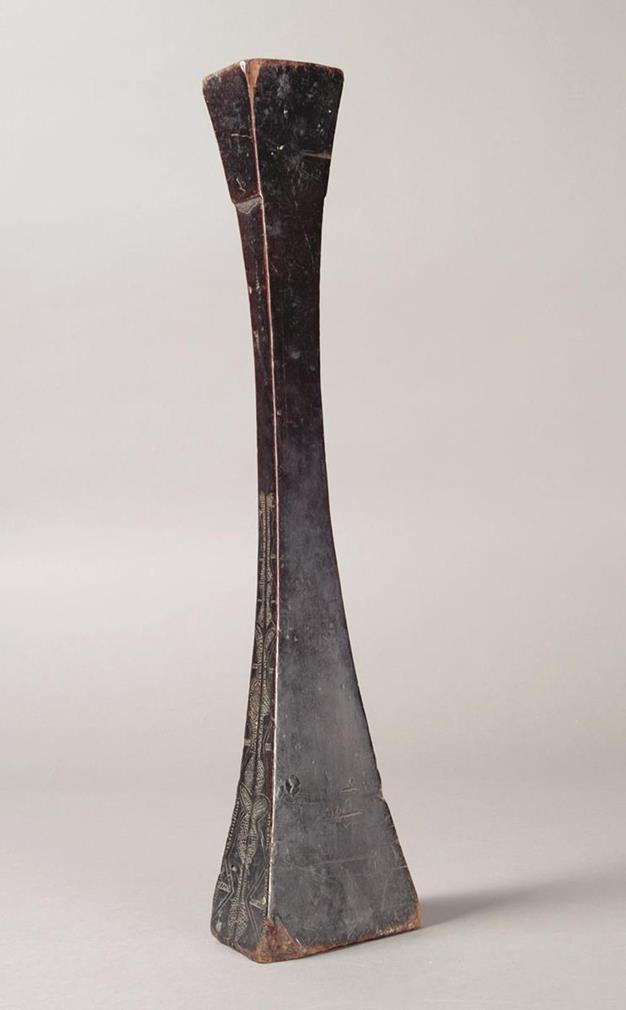wood, with incised stylised decoration to part of one side of the larger end and to the base of the handle, 19th century,