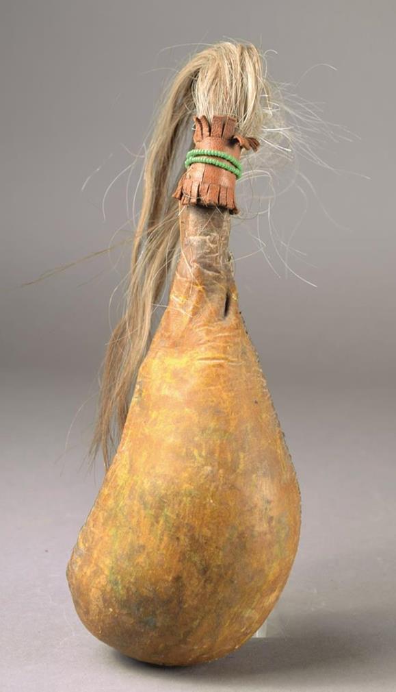 rawhide, leather, horse hair and beads, with remains of decoration, with a hand written label inscribed Baby Rattle, Tender Foot Indians,