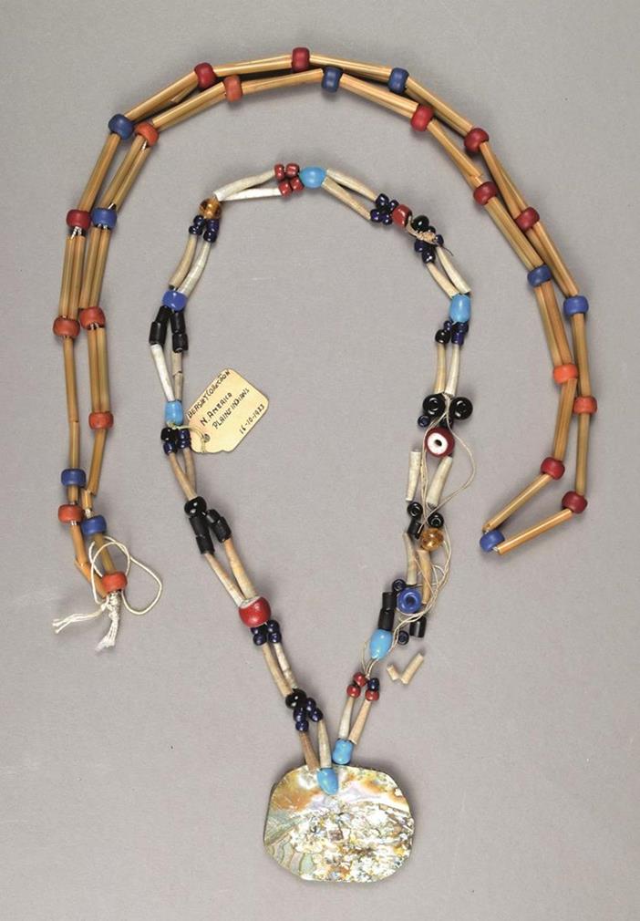 one strung with dentalium shell, blue, black and red glass beads with an oval haliotis shell pendant, with a hand written label BEASLEY COLLECTION, N.AMERICA PLAINS INDIANS 16-10-1933; the other with double straw colour glass tubes and red and blue glass beads. (2)