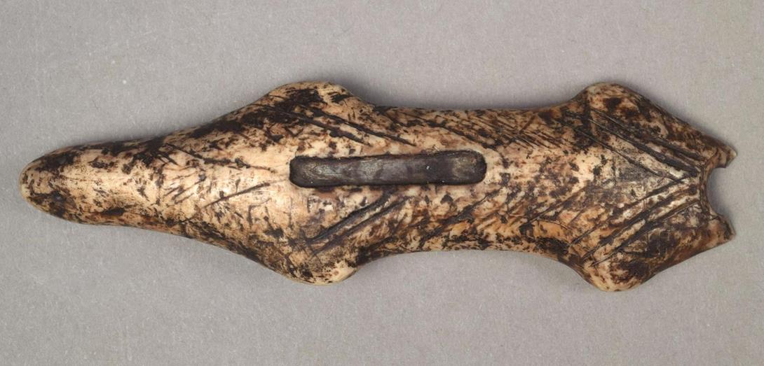 marine ivory, modelled as a seal or otter, with a shallow recess on its back, linear decoration and pierced underneath for attachment,