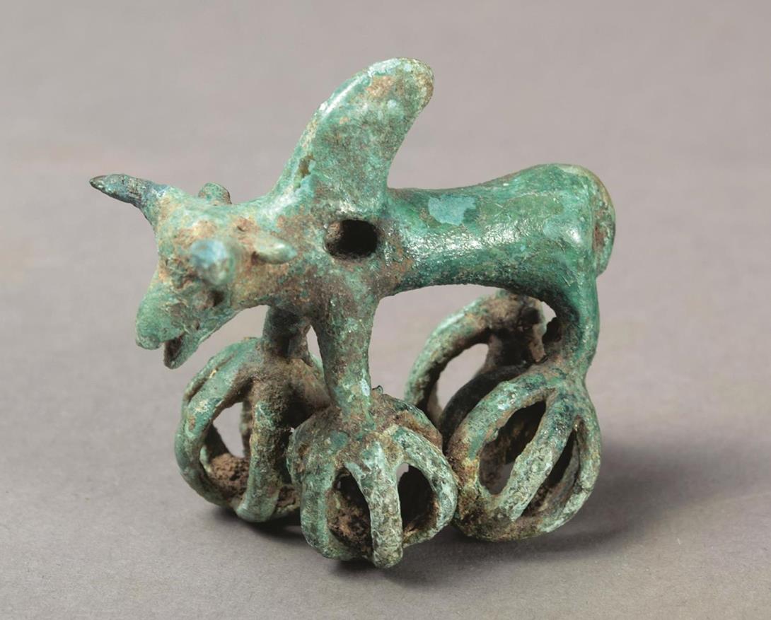 standing on open spherical feet, possibly bells, with a hump back with attachment piercing below, with a horned head with an open mouth,