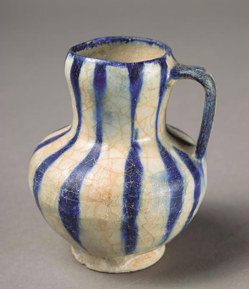 raised on a circular foot with a bulbous body and loop handle, with a white ground and underglaze blue stripes,