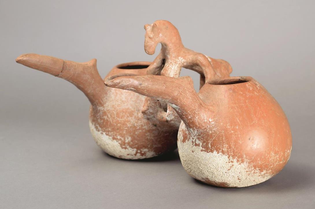 pottery, the two ovoid bodies with long beak like spouts, united by a standing horse,