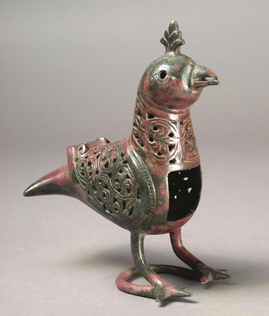 modelled as a standing partridge with a large square aperture to the chest and with a pierced and foliage engraved body, with a plume crest,