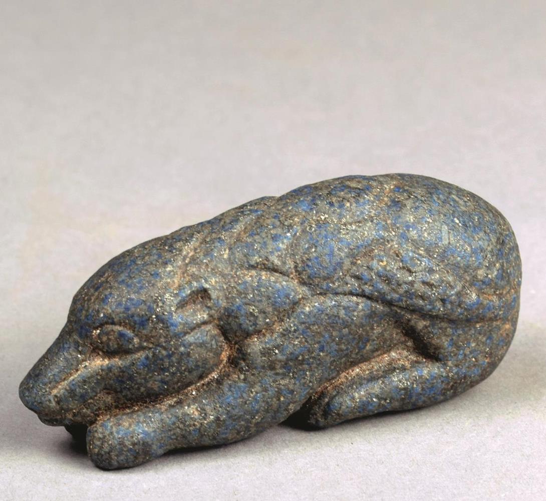 A lapis lazuli animal possibly Sumerian recumbent with a part scaly back and a long tail