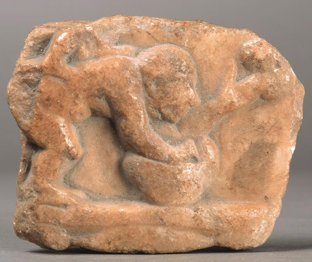 A Roman marble relief circa 1st - 2nd century AD the fragment depicting a bent figure picking fruit