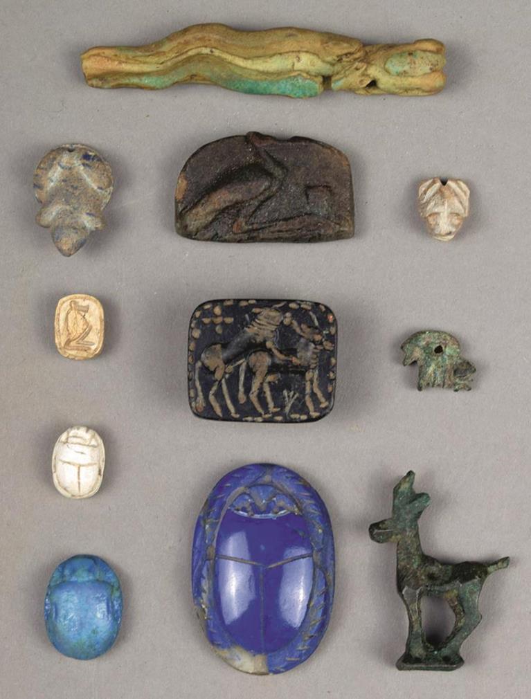 a lapiz lazuli scarab, a faience scarab bead, another clay both with an animal matrix, a bead with a baboon matrix, two frogs, a faience snake and mongoose amulet, a Middle Eastern brass animal pendant, an Assyrian hematite seal engraved mating cattle and a brass deer amulet. (11)
