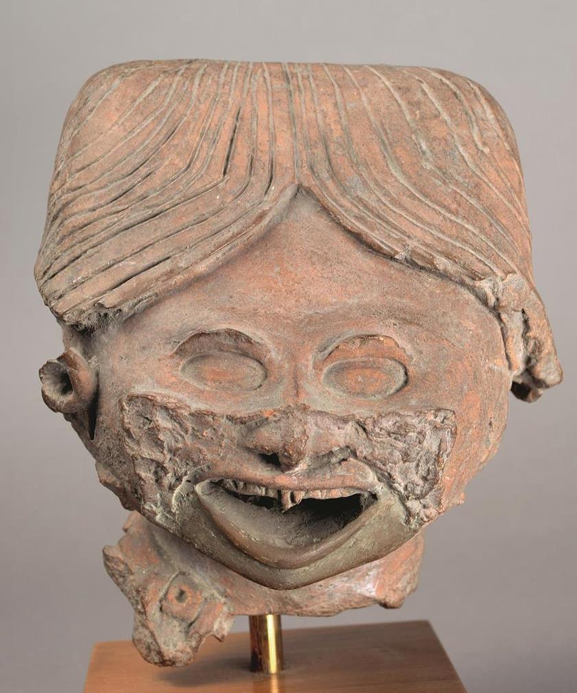 terracotta, with an incised linear coiffure, raised eyelids and filed teeth to the open mouth, an ear ornament to his right side and wearing a necklace,