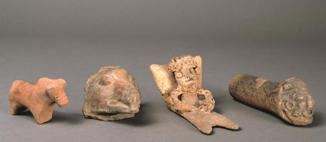 a pottery tubular handle with an open mouth mask terminal, a Persian pottery bull and a pottery animal head fragment. (4)