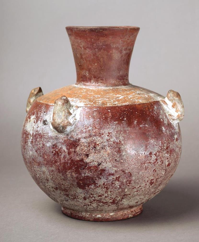 pottery, the bulbous body with four applied frogs to the shoulders, with a flared neck,