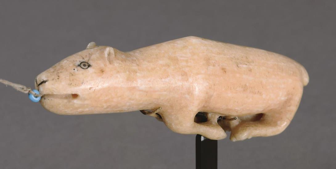 walrus ivory, with remains of gut string and a glass bead through the mouth, 19th century,