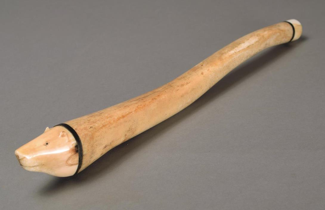 walrus baculum, penis bone, baleen and walrus ivory, with a carved polar bear head finial, 19th century,