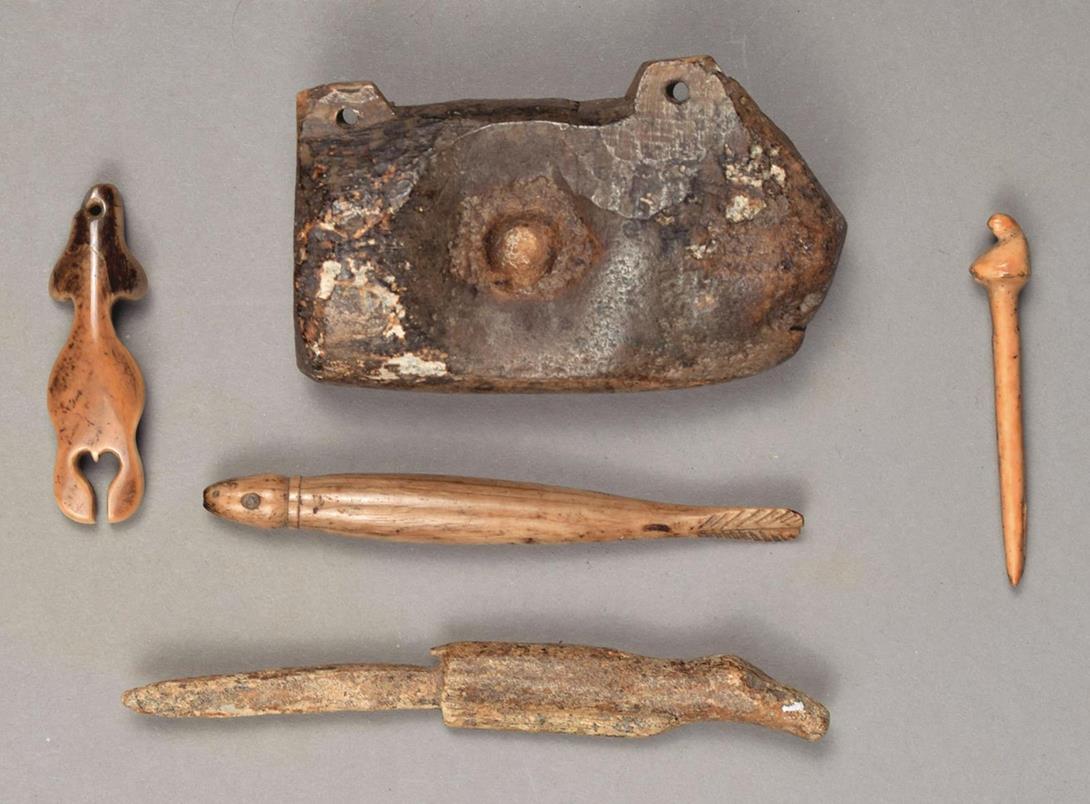 including a walrus ivory drill cap, with two attachment lugs and a central recess, 9cm long; a knife with a seal head finial, 12cm long; a seal amulet, 10cm long; an amulet with a stylised bird finial, 6.1cm long and a stylised zoomorphic amulet, 5.5cm long. (5)