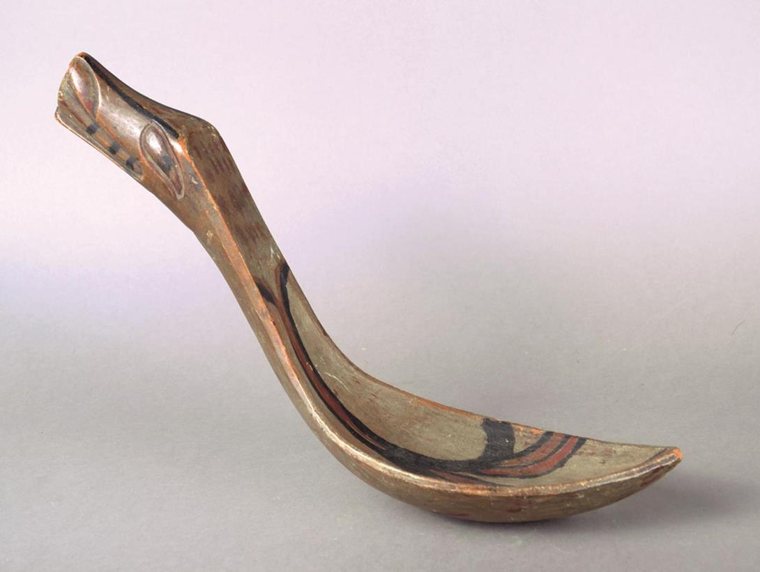 wood with polychrome decoration, with an elliptical bowl and a raven's head terminal,