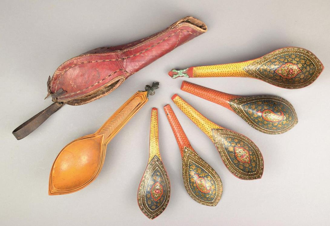 A graduated set of five Islamic sherbet spoons wood with all-over painted foliage decoration