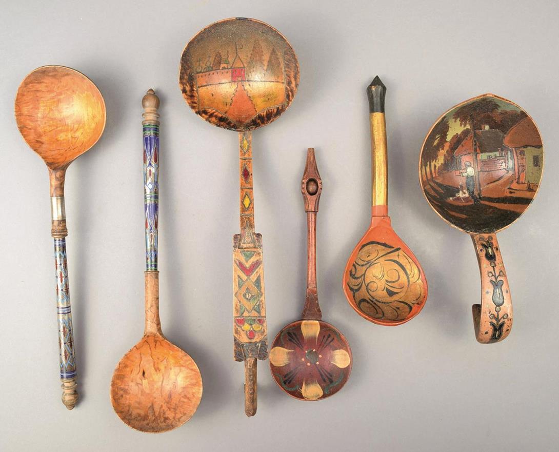 Two Russian birch and enamel spoons