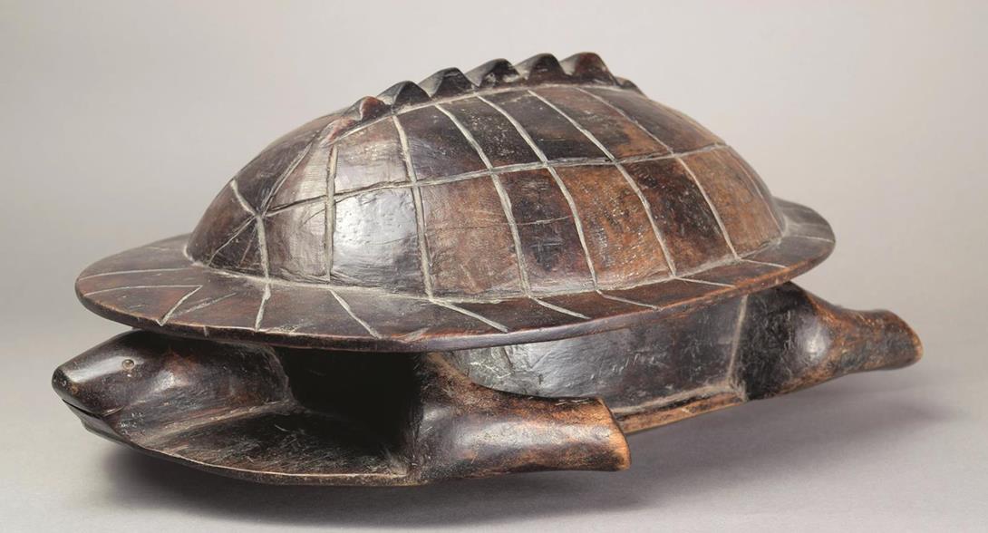 A Rotse lidded container South Africa wood in the form of a turtle with stained decoration