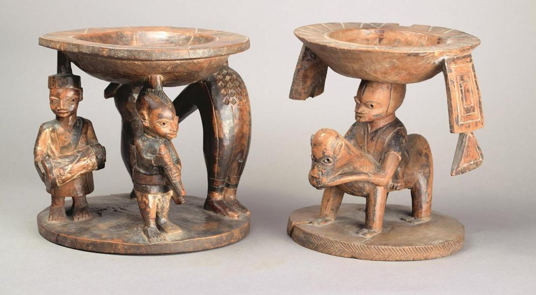 Two Yoruba divination bowls Nigeria wood; one with an Egungun masker and attendant