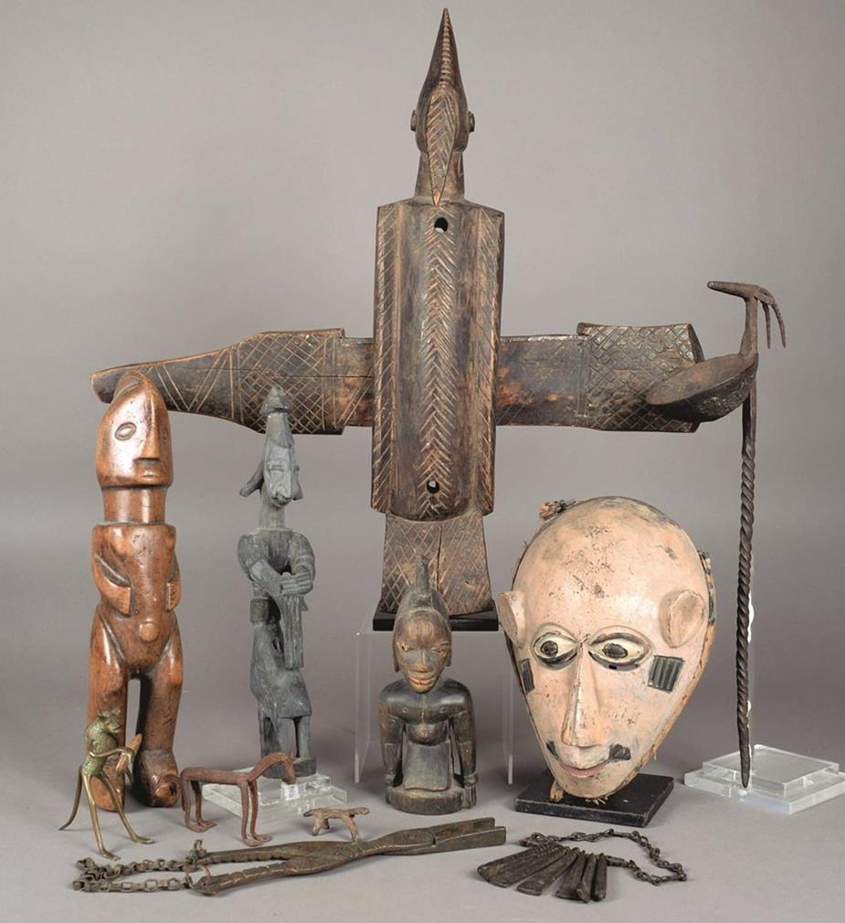 a Bambara door lock, two Yoruba figures, a standing figure, a Yoruba iron oil lamp, a Dogon horse and stylised animal, an iron Blacksmiths amulet, a pair of brass tongs and a Dohomey brass monkey. (12)