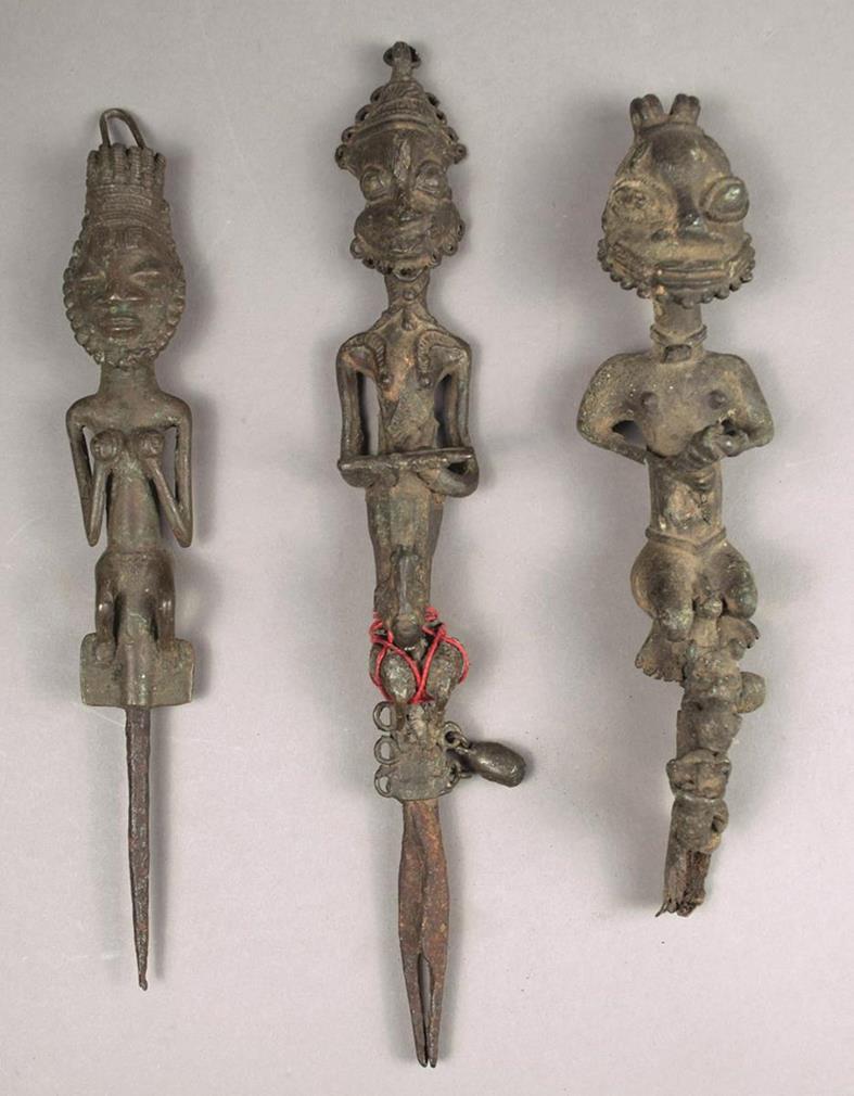 brass and iron, including two males, one with two monkeys below, the other with a bird and a female holding her breasts,