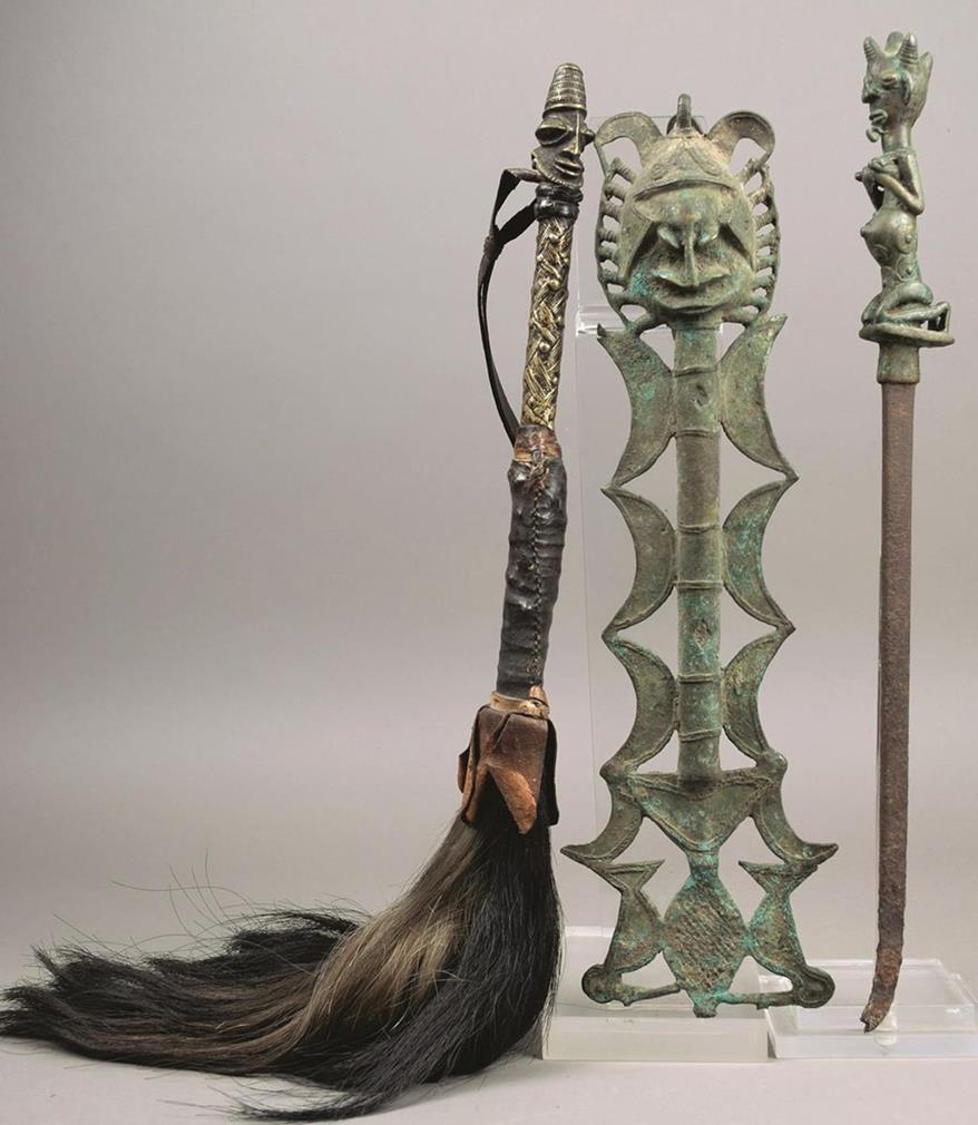 an Edan staff with a kneeling pregnant female holding her breasts and a brass, leather and animal hair fly whisk. (3)