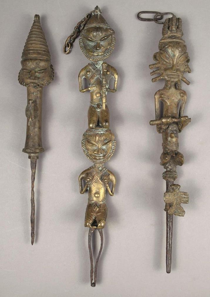 brass and iron, including a double male and female group, both kneeling and with beards and chest ornaments,
