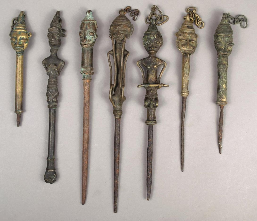 Seven Yoruba Edan staffs Nigeria brass and iron