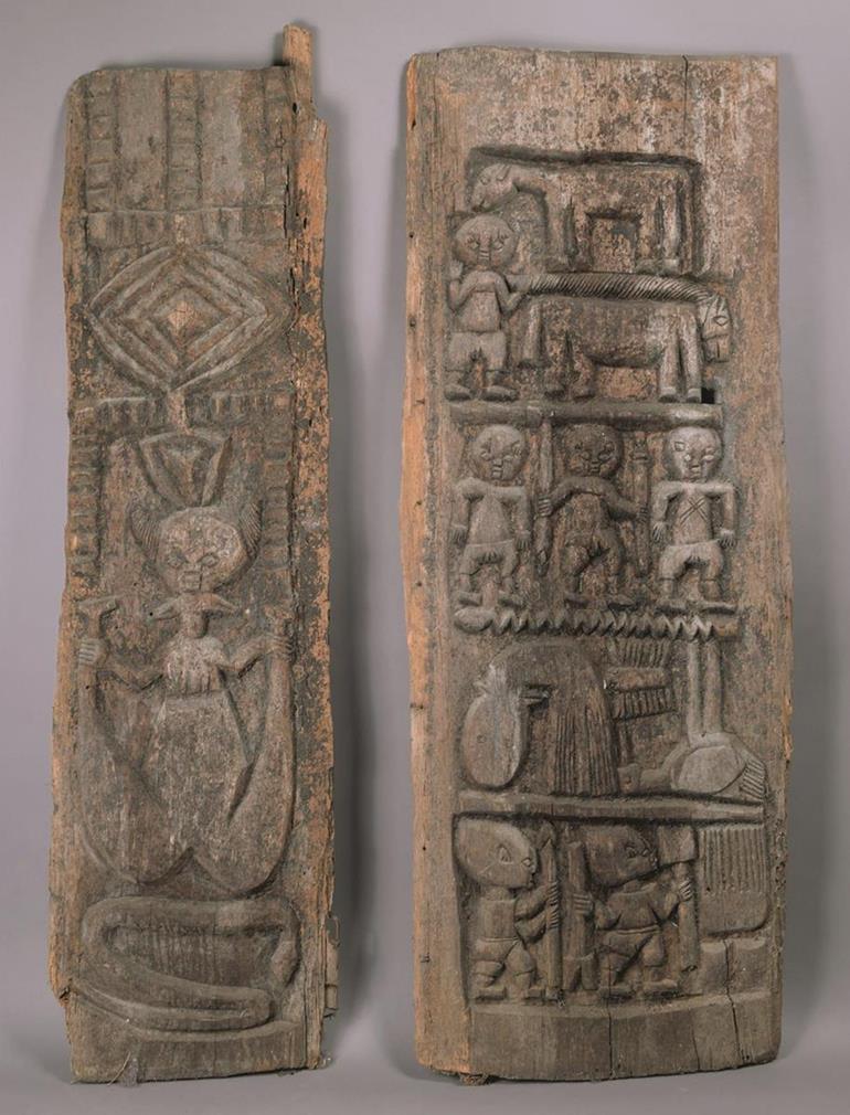 wood, carved animals, figures, a comb, a snake and the goddess Olokun,