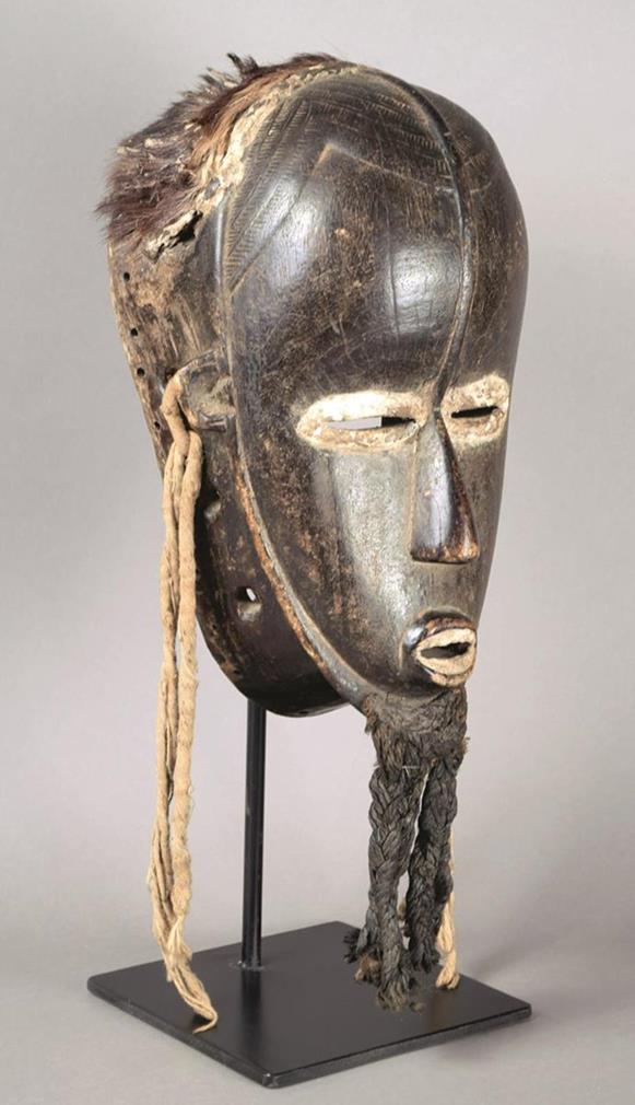 wood with white pigment highlights, fibre and fur, with a linear coiffure and a medial forehead ridge,