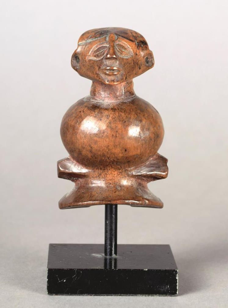 wood, with a head having an angular face and linear back coiffure, the neck pierced for attachment, with a spherical body and flared mouthpiece,