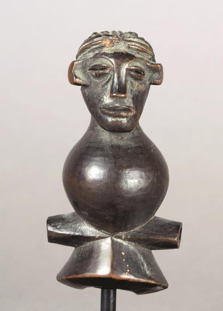 wood, with a head having a diced and linear coiffure, the neck pierced for attachment, a spherical body and flared mouthpiece,