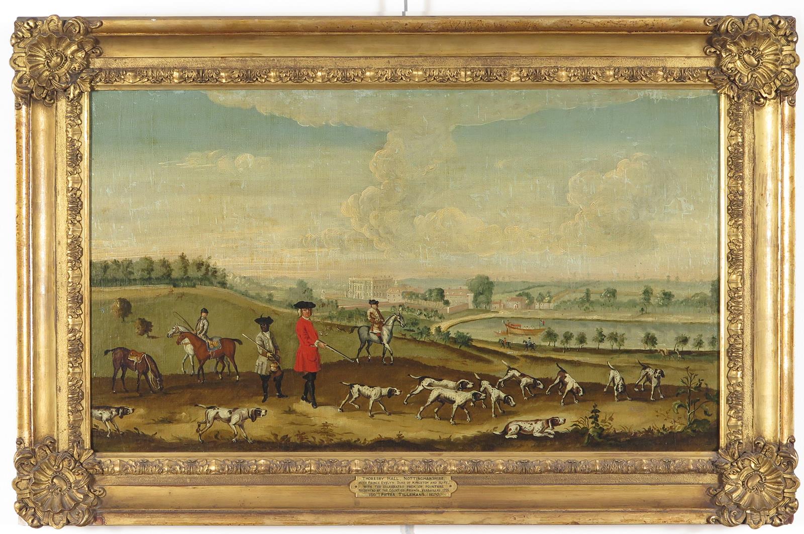 Evelyn Pierrepoint, 2nd Duke of Kingston-upon-Hull and suite with the celebrated pack of pointers which were presented by the court of France at Versailles, 1725, with Thoresby Hall, Nottinghamshire beyond