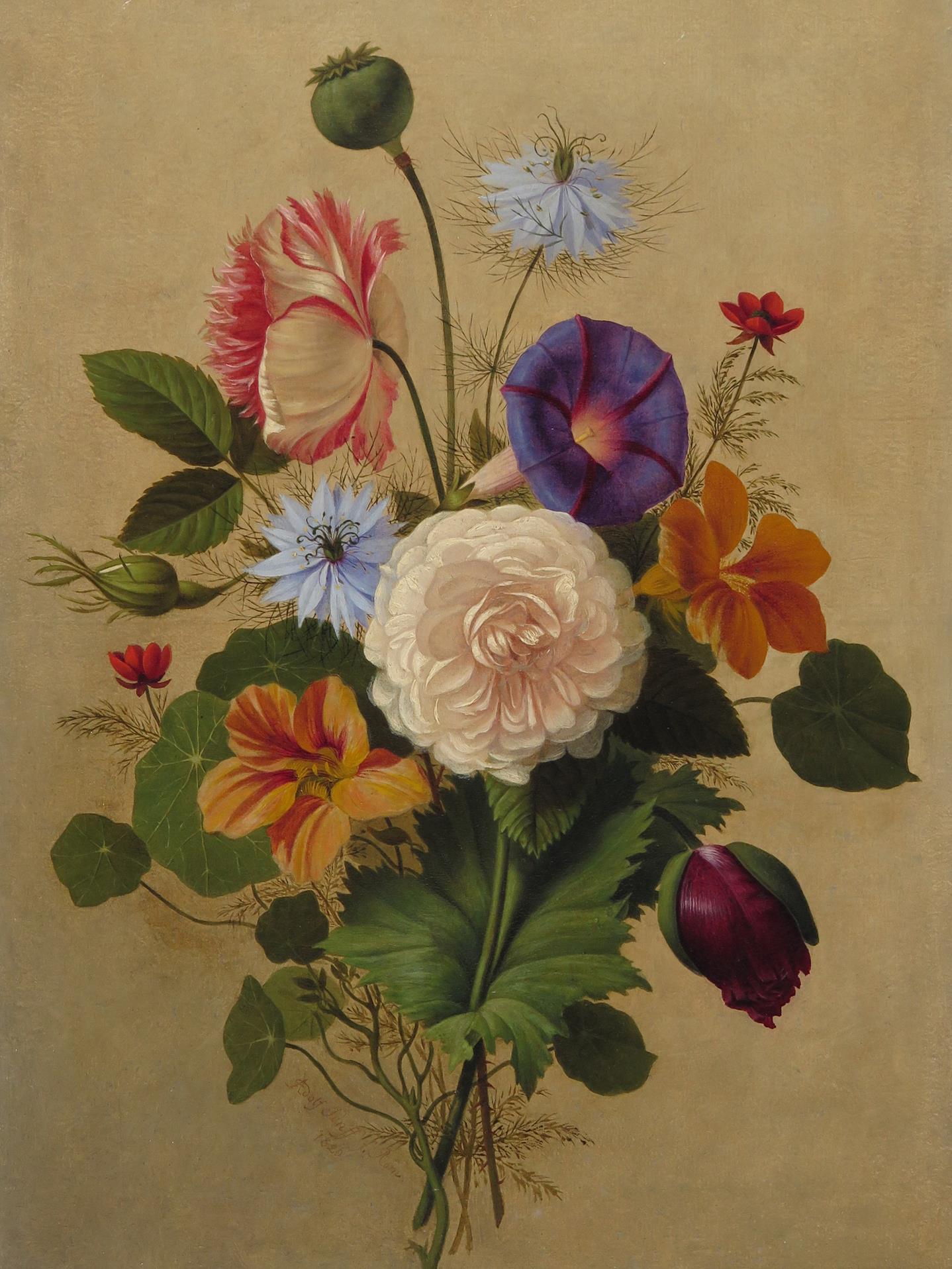 Still life of nasturtiums, poppies, a rose and nigella