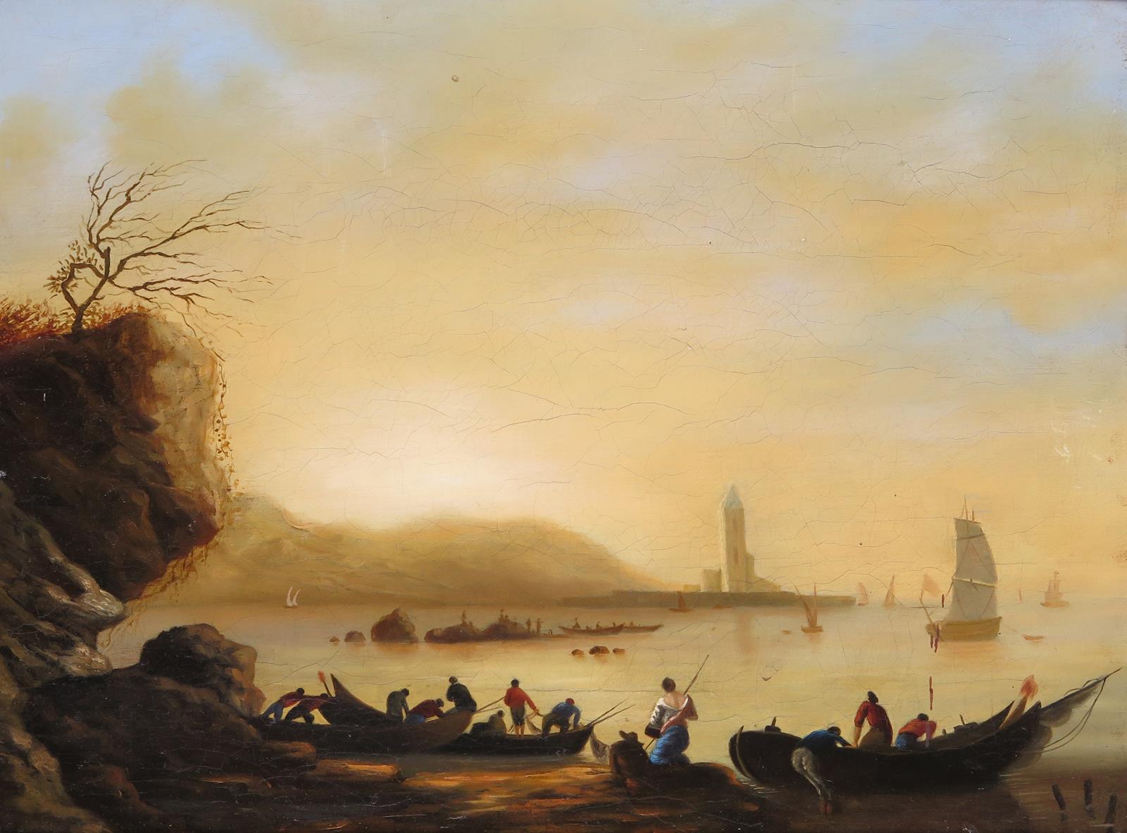 Manner of Claude Lorrain Figures with boats on the shore of a lake