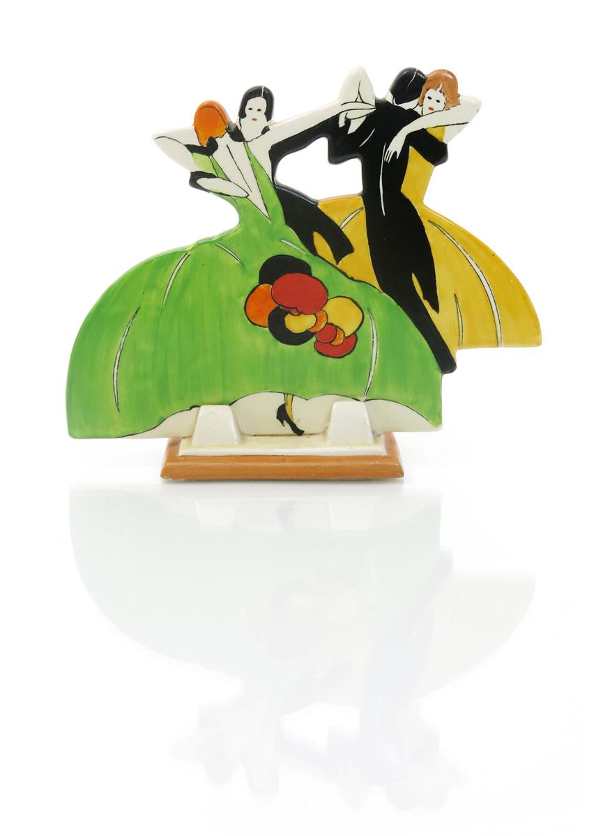 'Age of Jazz' a rare Clarice Cliff Bizarre table centrepiece, model no.434, modelled as two pairs of dancers, painted in colours, printed factory marks, 21.5cm. diam.