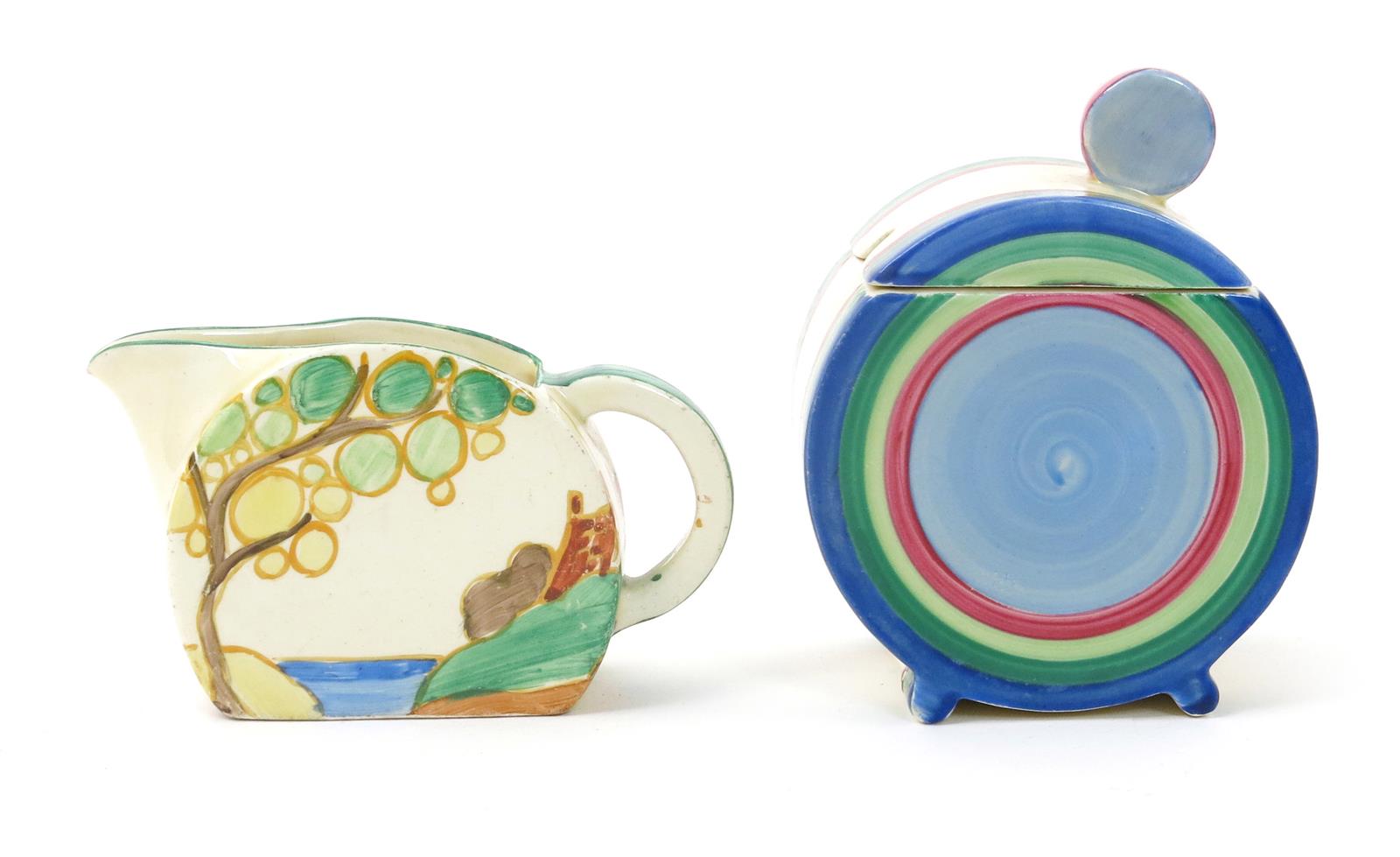 'Secrets' a Clarice Cliff Bizarre Bon Jour milk jug, painted in colours, and a Bon Jour preserve pot and cover painted with bands, printed factory marks, 6cm. high (jug), (2)