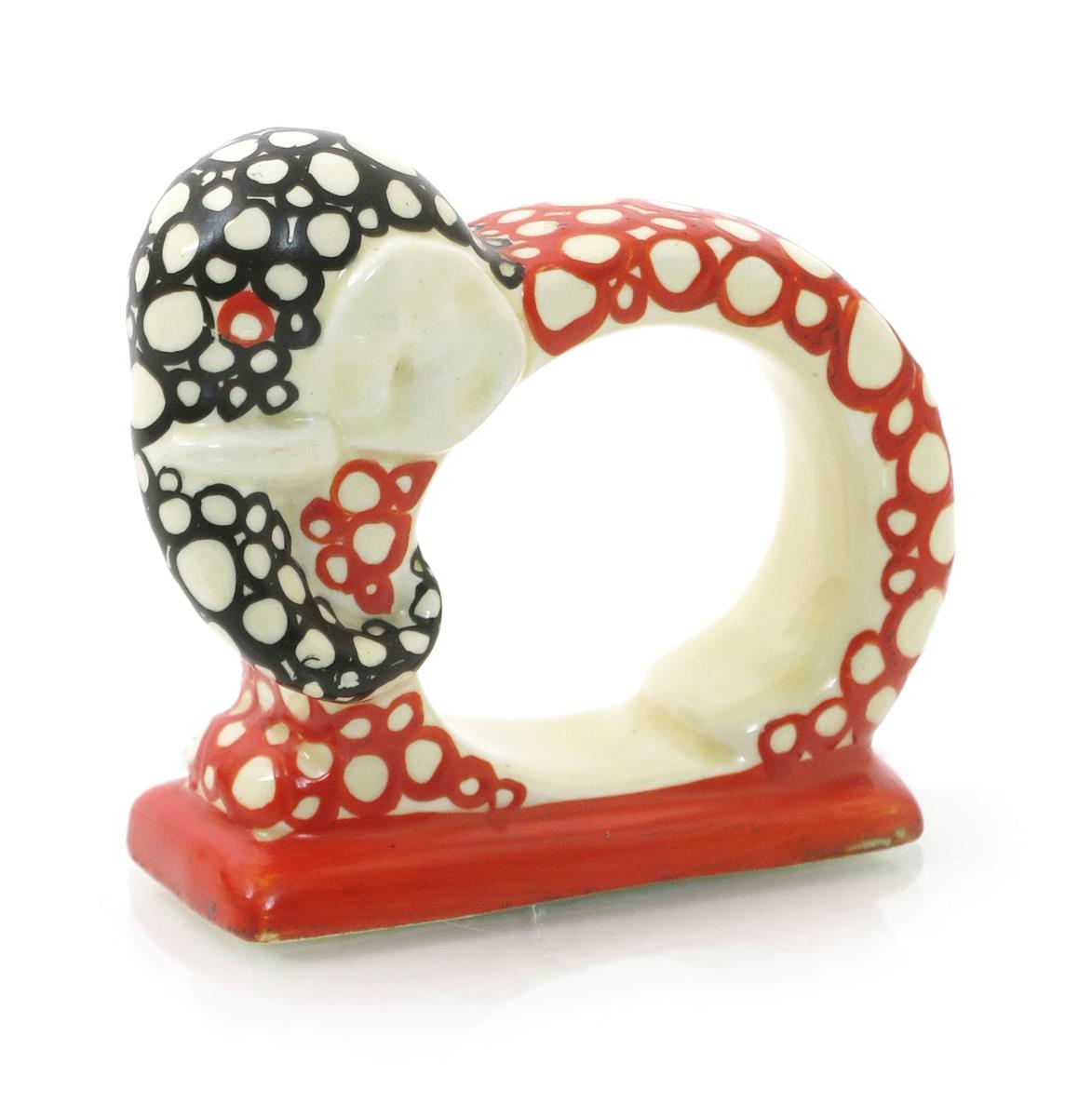 'Bubbles' a rare Clarice Cliff Elephant napkin ring, painted in shades of Coral red and black, printed factory mark, 8cm. wide.