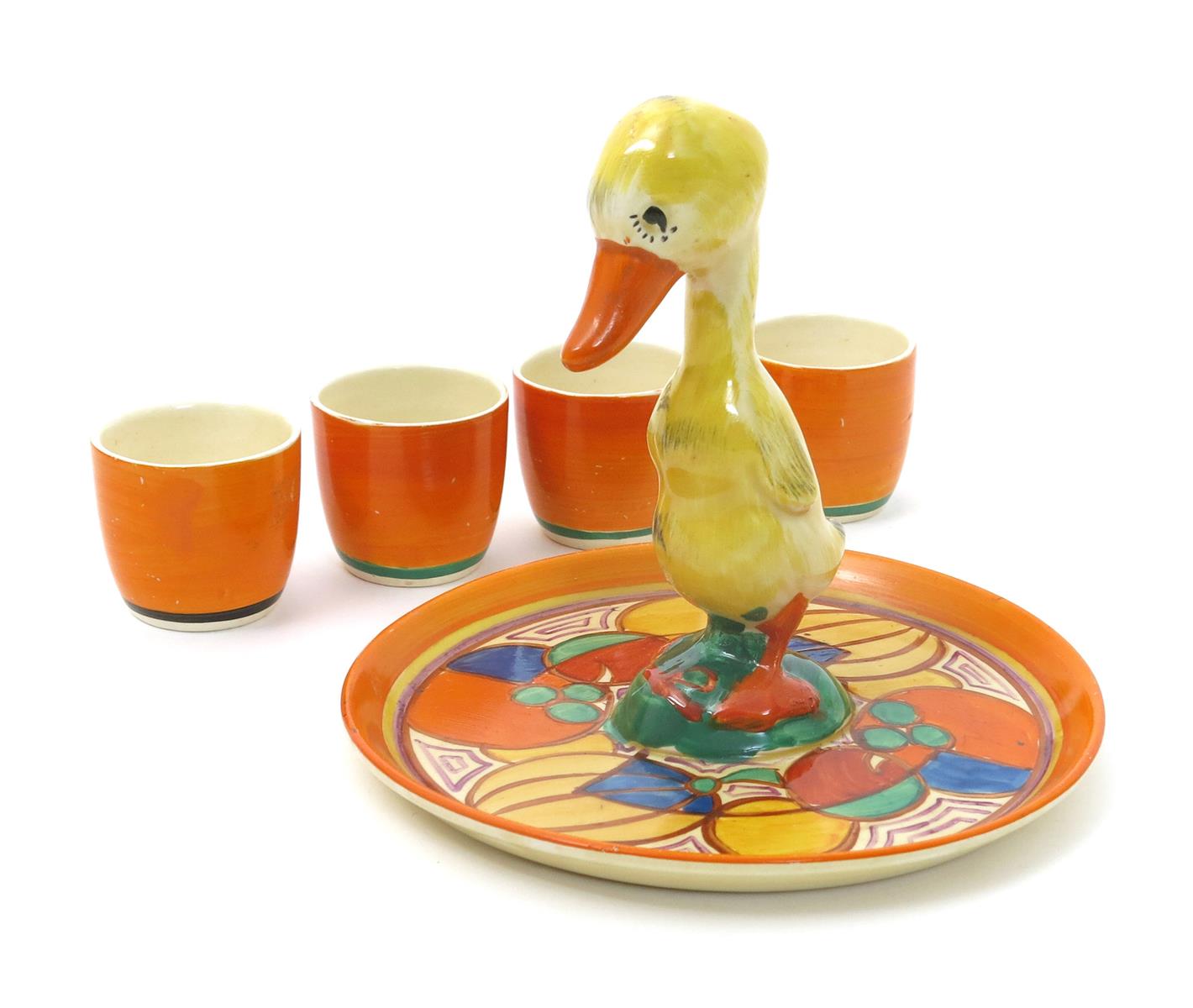 'Melon' a Clarice Cliff Duck egg cruet set, comprising tray, painted in colours inside orange band, and four Bizarre egg cups painted with a broad orange band, printed marks, impressed date code, restored ankles, 14cm. high, (5)