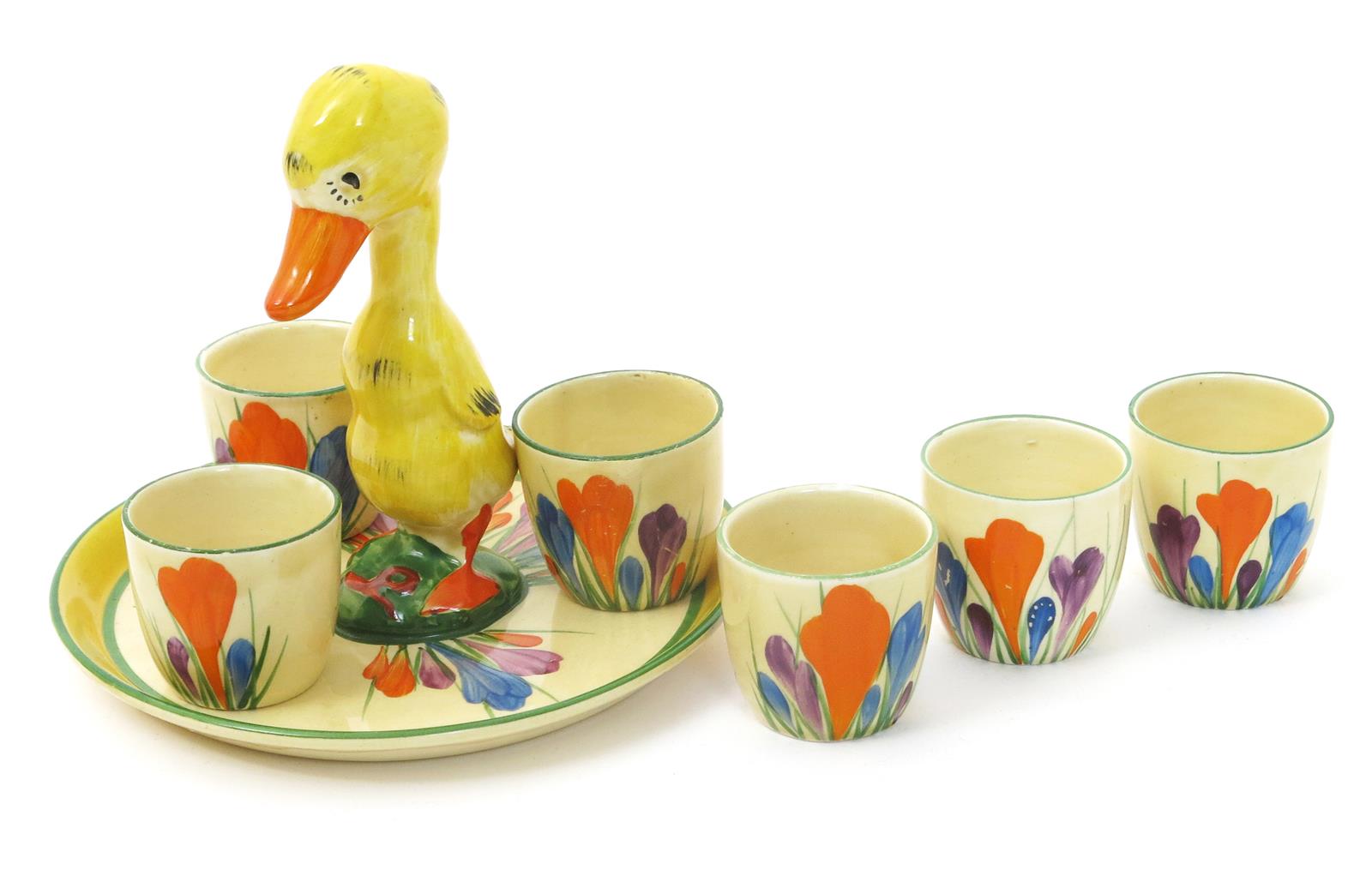 'Crocus' a Clarice Cliff Bizarre Duck egg cruet set, comprising tray and six egg cups, all painted in colours printed factory marks, hairline to one egg cup, 14cm. high (7)